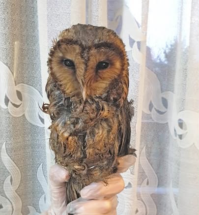 Bele esett a gépzsírba és szó szerint nyakig zsíros az egész madár. Ragad minden porcikája, és nagyon el van gyengülve. Megkezdtük a teljes tollazat tisztítását egy langyos samponos fürdőn már átesett. Valamennyire sikerült feloldani a rengeteg zsírt, de több lépcsőben kell majd a tollazatát megtisztítani. Szurkoljatok neki nagyon ráfér szegénykére.