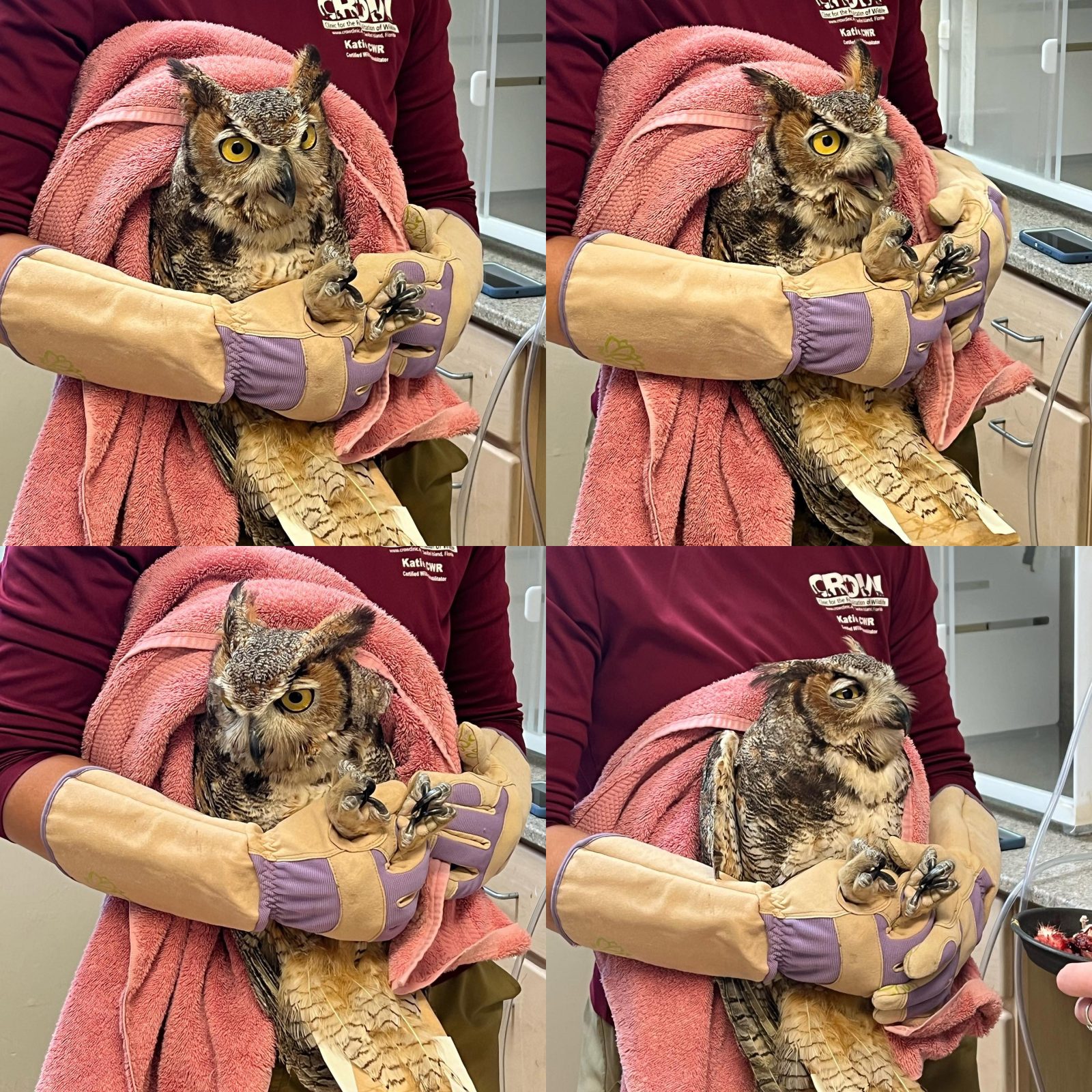 Which Great Horned Owl mood are you this morning? This Great Horned Owl (24-1367) was admitted from North Fort Myers after it was found stumbling around the finder’s back yard. Upon admission, the patient was emaciated, but showed no other significant findings. The patient was given pain medication and other supportive care.